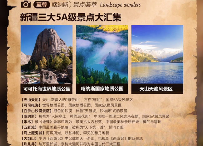 【白沙山沙漠】(贈送,游覽約1小時)白沙山意為銀色的沙漠,只有460米高,高度上在帕米爾高原上確實比較弱,但白沙山長度卻綿延1200米,每當有勁風吹來,白沙山都會發(fā)出響聲,故而又被稱作“響沙山”。與白沙山緊鄰的兩個湖泊,水草豐美,水鳥聚集,為這座白色的山峰平添了幾分清新活力。從遠處望去,在遠方的青山和近處綠草的映襯下,白沙山有的像埃及的金字塔,有的像棱角分明的歐式建筑,還有的像一條銀色巨龍靜臥在碧波蕩漾的大海上。銀色的細沙潔白柔和,像嬰兒的肌膚,令人心動,不忍下足。獨家贈送【全地形沖浪車激情體驗】(專業(yè)車手駕駛 贈送項目自愿放棄,不做任何退費)隨著車速的增加,沖浪車猶如一艘勇敢的船只,在沙丘之間往返穿梭,留下一道道深深淺淺的車轍,沙丘在車輪下迅速閃過,仿佛一朵朵巨大的浪花在沙漠中翻滾,翻越陡峭的沙丘,穿越沙漠中的障礙 ,給人帶來前所未有的刺激和樂趣,以及征服自然的成就感;【喀納斯景區(qū)】(含門票+區(qū)間車,游覽時間約2小時)國家AAAAA級旅游景區(qū),位于新疆維吾爾自治區(qū)阿勒泰地區(qū)布爾津縣北部,有駝頸灣、變色湖、臥龍灣、月亮灣、神仙灣等主要景點;電影[天地英雄]、劉若英-[分開旅行][原來你也在這里]的取景地;【圖瓦人探秘】(贈送,游覽約1小時)進入圖瓦人家木屋,圍坐在一起,品嘗香醇的奶酒、奶酪、民族點心,聆聽圖瓦人特有的民族樂器-蘇爾演奏,婉轉(zhuǎn)的曲調(diào),悠遠悠長,恍若隔世,伴隨原汁原味的音樂欣賞蒙古族圖瓦人的磅礴舞姿,豪放有力,不禁讓人潸然淚下。