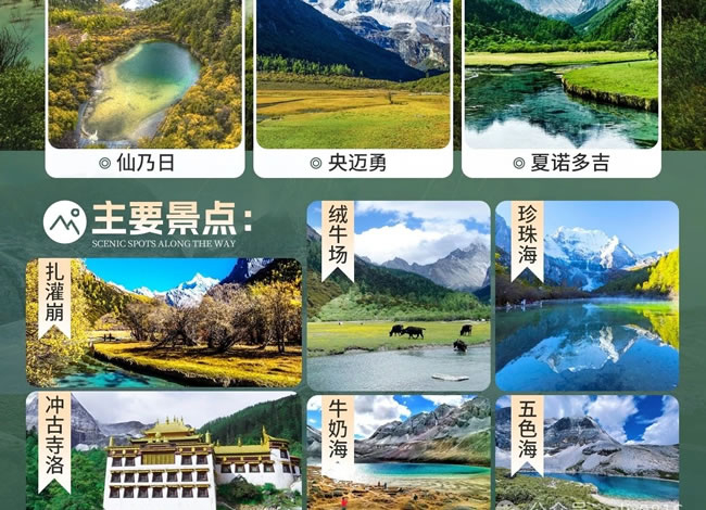早上:7:00 早餐后乘車經(jīng)波瓦山到達【亞丁景區(qū)】(門票已含,首次觀光車 120/人自理,必須消費),后在游客接待中心換乘景區(qū)觀光車抵達亞丁景區(qū)【扎灌崩】(40 公里,車程 1.5 小時),下車后游 客徒步上山直接抵達沖古寺。 中午:景區(qū)中餐自理,觀賞沖古寺風(fēng)光及神山仙乃日風(fēng)光,然后可自費乘坐電瓶車(自理往返 70/人,單程 40/人)前往【洛絨牛場】(如徒步需 1-2 小時左右達到洛絨牛場)。這里是觀【夏諾多吉神山】(意為金剛手菩薩,海拔 5958 米)【央邁勇神山】(意為金文殊菩薩,海拔 5958 米)的最佳地點,讓神山圣水與心共鳴,盡情沉醉在夢幻之地,后原路返回,到達【扎罐崩】乘觀光車返回住宿地。 晚上:回到日瓦鎮(zhèn)或稻城,晚餐后入住酒店。溫馨提示:因當(dāng)天游客出景區(qū)時間不統(tǒng)一,所以旅游車無法統(tǒng)一接送游客,游客可以選擇乘坐當(dāng)?shù)毓卉嚕?-10元/人自理)。亞丁景區(qū)分長線—牛奶海、五色海和短線—珍珠海游覽。長線游覽:因牛奶海和五色海海拔高,客人務(wù)必根據(jù)自身實際情況選擇是否前往(可選擇自費騎馬305元/人至舍身崖約1.5小時,再徒步至牛奶海和五色海需約1.5小時,冬季11中旬至次年3約中旬馬幫停運,需徒步單程5KM往返10KM,徒步往返時間約4.5小時)到達【牛奶?!浚偻讲角巴疚迳!浚ㄍ讲郊s20分鐘);【牛奶?!亢0?800米,又叫洛絨措,古冰川湖,狀如水滴,四周雪山環(huán)繞,湖水清瑩碧藍,山止成瀑,以其玲瓏秀雅水色翠藍而著名。牛奶海在央邁勇的山坳里,呈扇貝形,中間是碧藍的雪水,周邊則是一圈乳白色環(huán)繞,這圈乳白色大致就是牛奶海名稱的由來。牛奶海是美麗的,遠遠望去,仿佛碧玉鑲嵌在雪山之中,純凈安詳。純凈的湖水給人以平和安寧的心境,而藍湛湛的海子并不透明,顯得神秘莫測。傳說能治聾啞病的圣湖?!疚迳!亢0?600米,由于光的折射下,產(chǎn)生五種不同顏色而得名:其真名為“登崇措”。五色海它位于仙乃日與央邁勇之間,湖面呈圓形。面積0.7公頃,現(xiàn)代冰谷下伸至湖畔,雪山倒影湖面,呈現(xiàn)奇幻的色彩。是藏區(qū)著名的圣湖(佛經(jīng)中贊譽該湖與西藏羊巴雍措齊名),據(jù)傳能“返演歷史,預(yù)測未來”。短線游覽:游客可乘坐景區(qū)觀光車抵達扎灌崩,徒步500米到達沖古寺,前往仙乃日神山下的圣湖【珍珠?!慷叹€游覽(單程約1.5KM,徒步前往約40分鐘),海拔3950米?!菊渲楹!吭诓卣Z中稱為“卓瑪拉措”,是仙乃日的融雪形成的海子。面積約0.1平方公里。密林中的珍珠海如一顆鑲嵌在蓮花寶座上的綠寶石,碧波蕩漾,粼粼波光中透出無限清麗,湖畔四周,參翠如屏。春天湖邊片片杜鵑花燦爛怒放,秋天層林盡染,倒影著五彩斑斕的世界,令人目眩神迷?!緛喍【皡^(qū)】以仙乃日、央邁勇、夏諾多吉三座雪峰為核心區(qū),北南向分布,三座雪山呈品字形,三峰藏名為“念青貢嘎日松貢布”,意為“三怙主雪山”,是眾生朝圣積德之所在地。由于特殊的地理環(huán)境和自然氣候,形成了獨特的地貌和自然景觀,是中國保存最完整的一處自然生態(tài)系統(tǒng)。