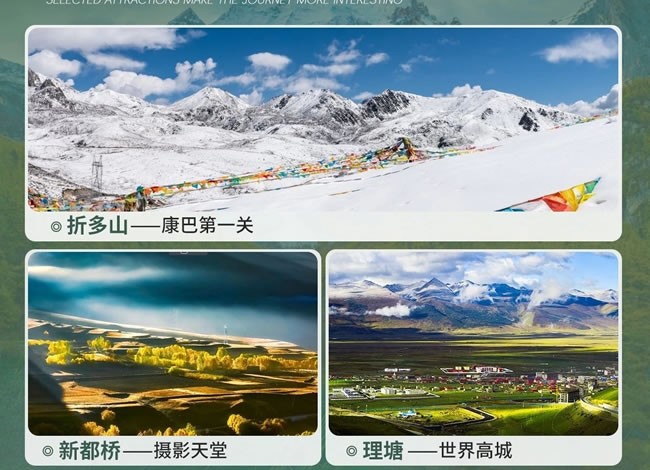 早上:集合地點統(tǒng)一出發(fā),出發(fā)時間以師傅/導(dǎo)游通知為準,從成綿高速、成雅高速經(jīng)雨城【雅安】(以雅女、雅魚、雅雨三絕而聞名是川藏、青藏的咽喉,也是古南方絲綢之路和茶馬古道的門戶必經(jīng)之路)。下高速后沿秀美青衣江而上,觀青衣江河谷風(fēng)光。中午:經(jīng)雅康高速一路向西,經(jīng)過【二郞山】隧道,欣賞“一山有陰陽”的兩種截然不同的奇觀,遠眺大渡河風(fēng)光(川西最大最深峽谷),后經(jīng)情歌故鄉(xiāng)【康定】午餐,海拔 2560 米。然后乘車前往有小九寨之稱的4A級風(fēng)景區(qū)-【康定情歌風(fēng)景區(qū)】(又名木格措風(fēng)景區(qū),門票贈送,觀光車90元/人自理,必須消費), 它坐落于貢嘎山脈中段,附近有其他多個高山湖泊和溫泉,原始森林,草原和雪山景觀互相交融。景區(qū)由木格措圣湖、杜鵑峽、藥池沸泉、七色海、芳草坪等景點組成。木格措湖景色一日多變,清晨坦面無垠的湖面靜如鏡面,倒映著雪峰和群山;午后波濤滾滾,濤聲如雷震撼山谷;傍晚夕陽西斜時湖面金光燦爛奪目。動靜交替的湖水,日變?nèi)f千。在此還可觀賞到“猛虎臥山”、“觀音鎮(zhèn)?!钡绕婷钌骄啊T诓煌竟?jié)還可欣賞“雙霧墜?!薄ⅰ澳靖裣φ铡?、“木格漲潮”和迭瀑飛泉等云、霧、霞、水奇觀;在珍珠灘可享受沙浴、日光浴之樂。海濱可享沙浴、日光浴之樂,湖中可乘坐游船(游船66元/人、游客可以根據(jù)自身情況自費乘坐游覽)。七色海是一處湖水與溫泉交融的高原湖泊,杜鵑峽是木格措景區(qū)的走廊,藥池沸泉泉眼數(shù)十個,景區(qū)以高山湖泊及溫泉為主要特色,融原始森林、草原、雪山為一體,互相映襯,一派原始古樸而幽靜的自然景色。木格措圣湖是川西北最大的高山湖泊之一,整個風(fēng)景區(qū)以圣湖、溫泉、雪山、草原、彩林、瀑布為主要特色,一派原始古樸而幽靜的自然景色,使人們仿佛置身于“瑤池仙境”。后翻越有“康巴第一關(guān)”的塞外屏障【折多山】,最高峰海拔 4900 米,埡口海拔 4298 米,也是川藏線上第一個需要翻越的高山埡口。至令人神往的“光與影的世界”“攝影家的天堂”【新都橋】。晚上:晚餐后入住新都橋/雅江酒店。游客若有需要可自行前往網(wǎng)紅打卡景點-【魚子西】(參考價格:小車擺渡費60-80/人+清潔費30/人請自理)屬于木雅貢嘎地區(qū),擁有以藏傳佛教為基礎(chǔ)的基本文化特征,項目范圍內(nèi)可 360 度遙望藏區(qū)四大神山之一藏區(qū)“第二香巴拉”的雅 拉神山全貌和四川最高峰“蜀山之王”的木雅貢嘎大雪山山系全貌,為貢嘎西坡地區(qū)難得的觀景攝影點。后帶著愉悅的心情乘車返回有攝影天堂之稱的【新都橋】。